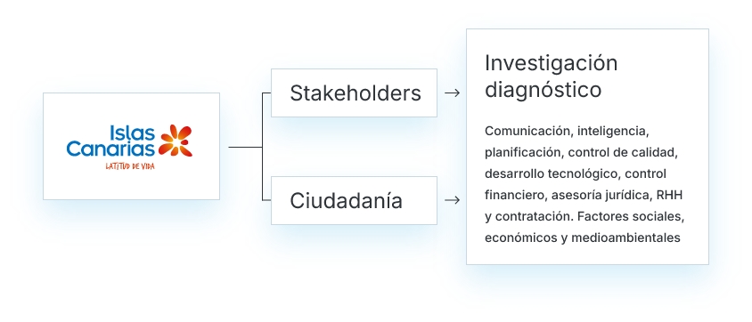 En esta fase de investigación resulta indispensable pues, definir esos problemas, y aparejado a esa definición estudiar los factores, políticos, económicos, sociales, tecnológicos, medioambientales y legales que afectan a los diferentes stakeholders en la relación con nuestra organización. Sin perder de vista los propios ejes de actuación establecidos en el plan estratégico 2025/27 de Turismo Islas Canarias, que estarán en el núcleo del mecanismo de actuación de este proyecto de estrategia de relaciones institucionales de Promotur Turismo Canarias S.A. Involucrando a la ciudadanía en la estrategia turística y mejorar la calidad del empleo; cooperar en reducir la huella de carbono y regenerar el entorno afectado por el turismo; implementar servicios digitales para mejorar la experiencia; utilizar la inteligencia, análisis e investigación para desarrollar planes de acción específicos; personalizar la experiencia del turista y promover productos turísticos de alto valor; y por último, contribuir en la mejora de la conectividad aérea con más destinos y mercados emisores.