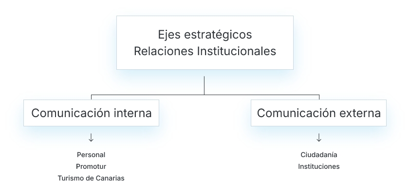 Al igual que en la mayoría de los procesos fundamentales de funcionamiento empresarial, las relaciones institucionales se convierten en una disciplina compleja, poliédrica, plagada de puntos de vista compuestos y perfiladas ante panoramas cambiantes. La planificación de estas se configura pues como una estrategia fundamental y cargada de significado, toda vez que estas relaciones se traducen en la herramienta institucional básica para mantener, salvaguardar y defender la visión, misión y valores de las instituciones. El contacto, directo o indirecto, con los diferentes grupos sociales no es una cuestión que pueda obviarse ni trascenderse sin arriesgar en todo momento a perder credibilidad, confianza y legitimidad. Estos grupos sociales se configuran como receptores de un mensaje fundamental y claro, emitido desde el punto de vista institucional y el cual, en su variedad intrínseca marcada por los contextos y codificaciones, será el núcleo de este proyecto de estrategia para Promotur Turismo Canarias S.A.